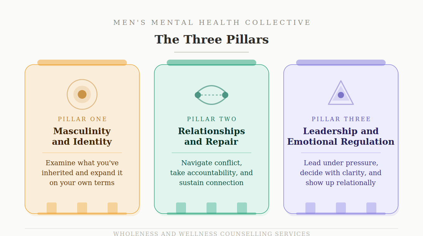 A 6-week facilitated group experience with 6–10 participants. This format is intentionally designed to normalise the work. Men engage in guided dialogue, shared reflection, and practical tools across the three pillars. Learning alongside other men deepens accountability and impact.
